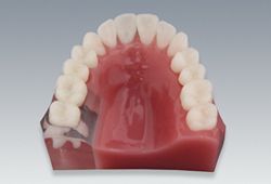 クリアピンク色のソフトタイプ粘膜を装着した顎模型。 半透明粘膜のため、歯肉縁下のマージンや歯肉圧排糸...