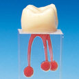 初期の髄室開孔・根管拡大・根管充填の実習のため、透明ブロックに歯冠、髄室、根管を付与したモデル。